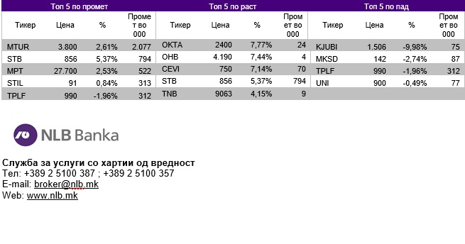 Најтргувана беше акцијата на Македонијатурист со промет од два милиона денари, или количество од 547, по цена 3.797,44 денари. Следеа акциите на Стопанска банка Скопје со промет од 0,79 милиони денари,на Макпетрол со 0,5 милиони, на РЖ Макстил со 0,3 милиони) итн…
