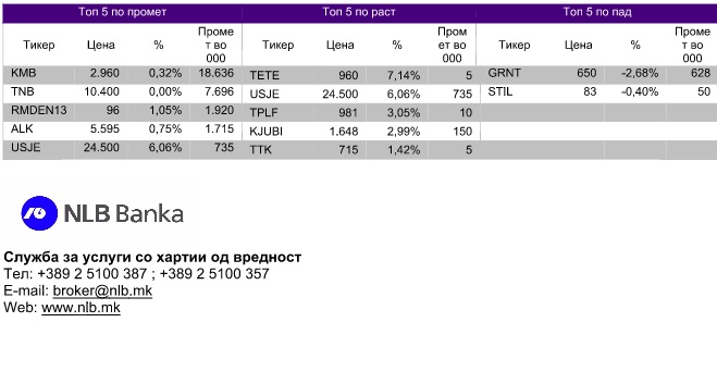 Повеќе од третина од остварениот промет припадна на трансакциите со акции издадени од Комерцијална Банка АД Скопје со вкупен износ од 18,6 милиони денари. Со акциите на НЛБ Банка АД Скопје беше остварен промет со вкупен износ од 7,7 милиони денари .
