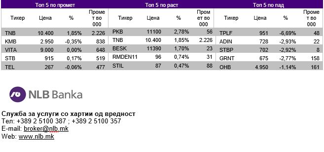 Вкупно 215 акции од НЛБ Банка по просечна цена од 10.353,49 денари беа истргувани во петокот, со што беше остварен вкупен промет од 2.226.000 денари и раст на акцијата од 1,85 отсто.