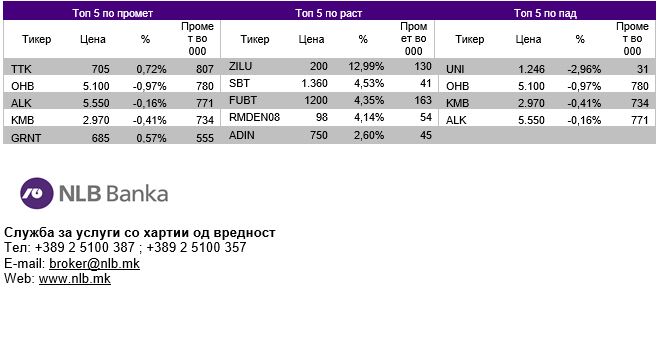 Најтргувана акција со вкупен промет од 807.235 денари беше акцијата на ТТК Банка АД Скопје, а по неа следеше уште една банка Охридска со вкупен промет од 780.270 денари.