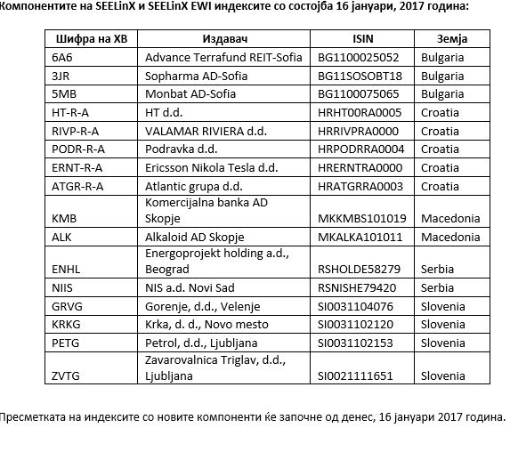 Пресметката на индексите со новите компоненти ќе започне од понеделникот, 16-ти јануари 2017 година.