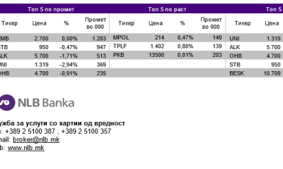Вкупниот промет изнесуваше околу 10 милиони денари и беше реалзиран преку 64 трансакција, а се тргуваше со 17 хартии. Индексот МБИ10 порасна за 0,26% и достигна вредност од 2.101,15 денари, а ОМБ остана на вчерашната вредност./крај/мф/кн