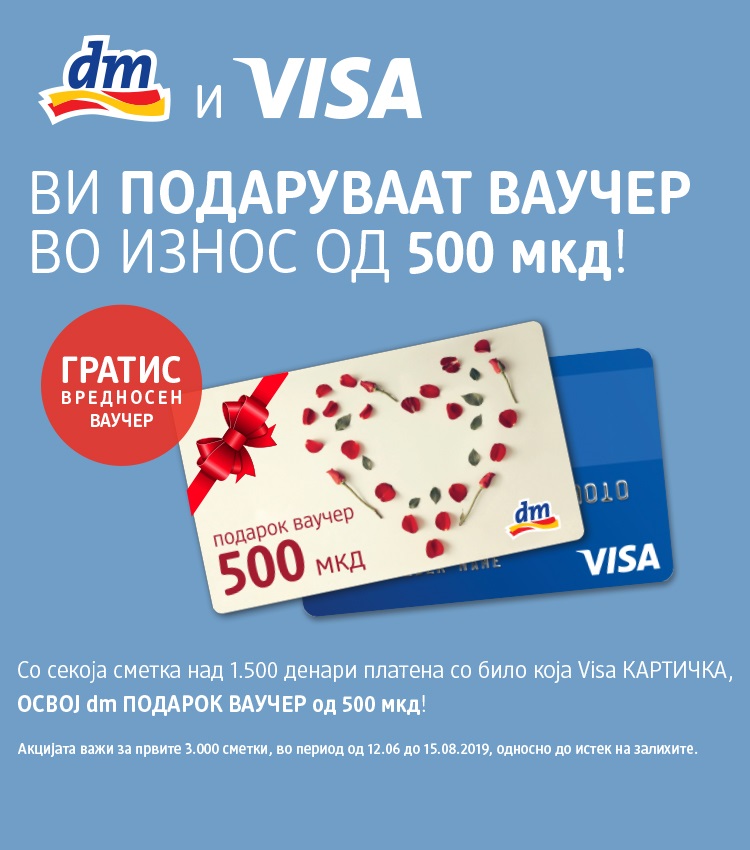 Почнувајќи од 12.6.2019, за секоја сметка направена во дрогериите на dm, чиј износ надминува 1.500 денари, а е платена со билоа која VISA картичка добивате вредносен ваучер од 500 денари. А да се потсетиме, во dm дрогериите можете да пронајдете повеќе од 14.000 производи за нега и убавина, производи за нега на мажи и бебиња, производи за хигиена во домот како и нега на алишта, природна козметика и органска храна.
