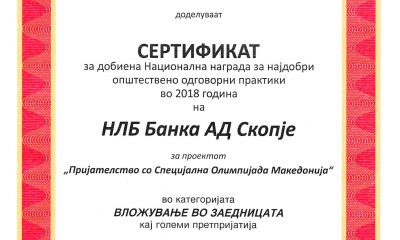 НЛБ Банка АД Скопје е добитник на Националната награда за најдобри општествено одговорни практики за 2018 година, во категоријата вложување во заедницата со проектот „Пријателство со...