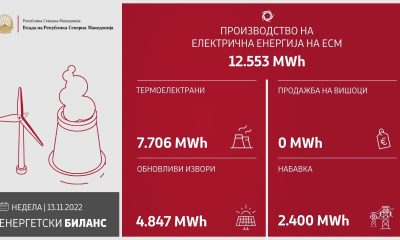 АД ЕСМ на 13.11.2022 година произведе 12.553 MWh електрична енергија. Во термоелектраните произведени се 7.706 MWh, а во хидроелектраните и во ветерниот парк во Богданци произведени...