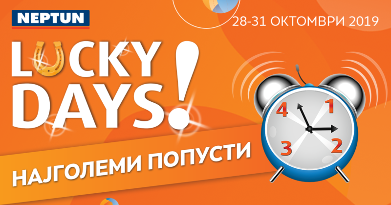 Lucky days од 28 до 31.10.2019 во „Нептун“ – продажна акција со најголеми попусти! Овие „Среќни денови“ на потрошувачите ќе им овозможат покомфорен шопинг – да купуваат ем на попусти ем до 60 рати со haPPy-инстант кредитот.