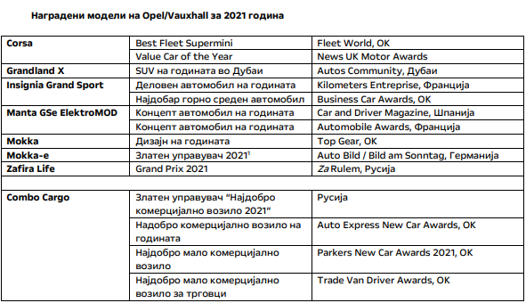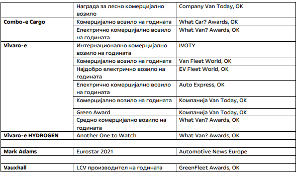 Opel Vivaro-e веќе беше прогласен за „Интернационално комерцијално возило за 2021“ на крајот на минатата година. Ценетиот трофеј потоа стигна до седиштето на Opel во Rüsselsheim пролетта. Ова беше почеток на серија награди за најпродавано лесно комерцијално возило со електричен погон. Само во Обединетото Кралство, Vivaro-e собра бројни награди како „Електрично комерцијално возило на годината“. Потоа, Combo (со мотор со внатрешно согорување или како целосно електричен Combo-e) собра многу награди низ Европа во текот на годината.