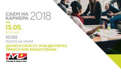Агенцијата за млади и спорт првпат годинава го организира настанот Саем на кариера 2018, кој ќе се одржи на 15 мај со почеток во 10 часот...