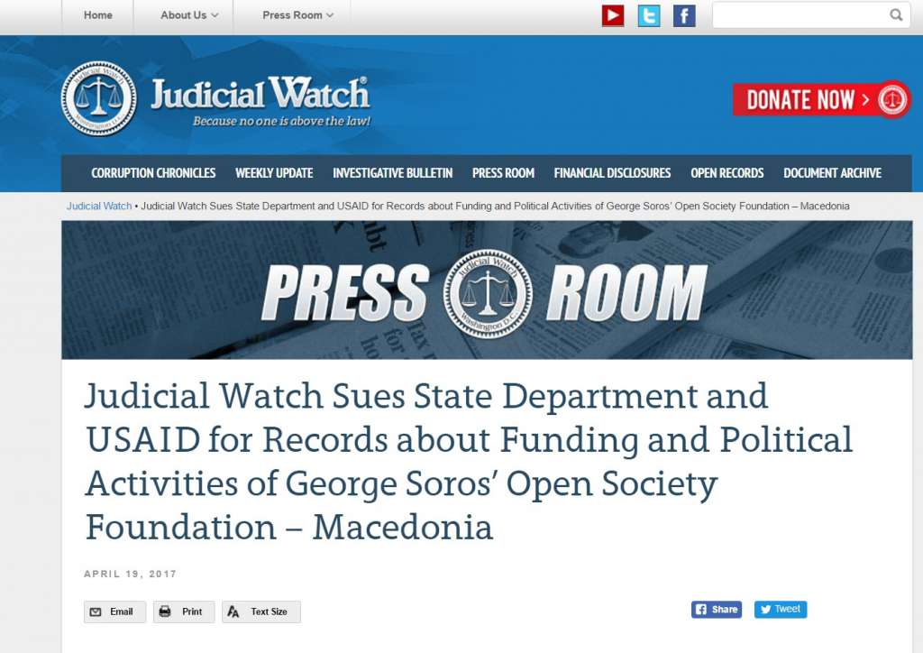 На официјалната веб-страница на организацијата „Џудишл Воч“ пишува дека станува збор за тужба против Стејт Департментот и Агенцијата УСАИД во Македонија. „Џудишал воч“ денеска објави дека поднеле тужба според Актот за слобода на информации против Стејт департментот и американската агенција за меѓународен развој (УСАИД) заради податоци и комуникации во врска со финансирањето и политичките активности на Фондацијата Отворено општество – Македонија“, пишува на официјалната веб-страница на организацијата.