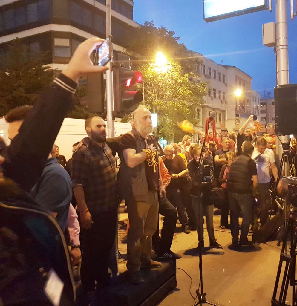 „Ова сценарио е за разнебитување на Македонскиот народ, ако не сме заедно ќе не нè нема, ќе ја нема ни Македонија, ќе ја крстат како што сакаат, ќе пејат химни, ќе менуваат знамиња“, рече во своето обраќање Борис Дамовски на протестот пред канцеларијата на ЕУ во Скопје.