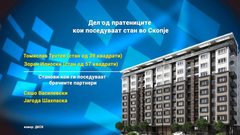 Дел од пратениците кои се најдоа во ТОП 20, според патните трошоци според нивните анкетни листови кои ги доставиле до Антикорупциска, поседуваат и станови во Скопје. Томислав Тунтев во имотниот лист пријавил дека поседува стан од 39 квадрати во Скопје. Пратеникот Зоран Илиоски од ВМРО-ДПМНЕ исто така пријавил дека има стан во Скопје од 57 квадрати. Неговиот колега од истата партија, Сашо Василевски, пријавил дека неговата сопруга има стан во Скопје од 91 квадрат, а исто така и пратеничката Јагода Шахпаска пријавила стан од 62м2 како имот на сопругот.