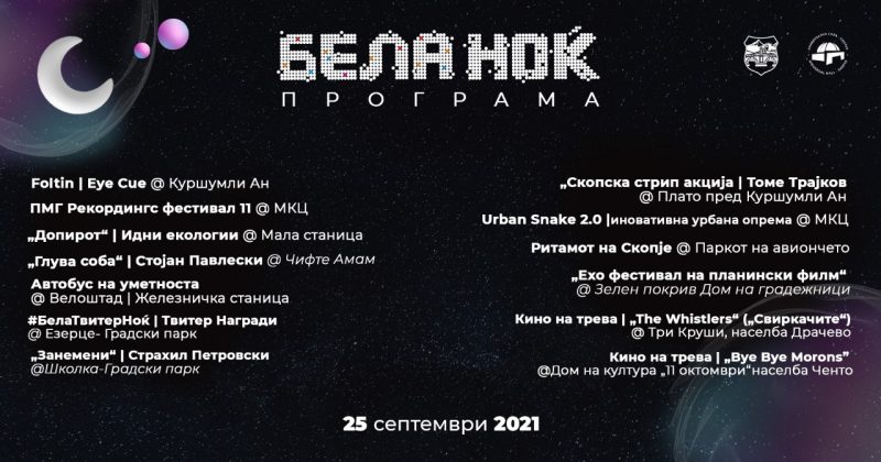 Официјалната програма на „Бела ноќ“ ќе почне утре, 25 септември, сабота, во 19 часот и ќе трае сè до полноќ, а поради состојбата со коронавирусот, работното време на локалите ќе остане исто, односно нема да работат во текот на целата ноќ.