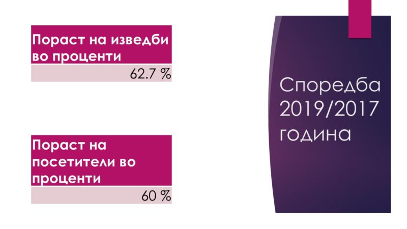 Секторот аналитика при својата работа утврди и дека во 2019 на сцената на „Театар комедија“ се одиграни вкупно 179 престави, а бројот на посетители за 2019 изнесува 46.609. Меѓу другото се изврши и споредба на бројот на изведби и посетители заклучно за периодот 2017-2019, при што се утврди пораст на бројот на изведби од 62,7 проценти и пораст на посетеноста за 60 проценти.