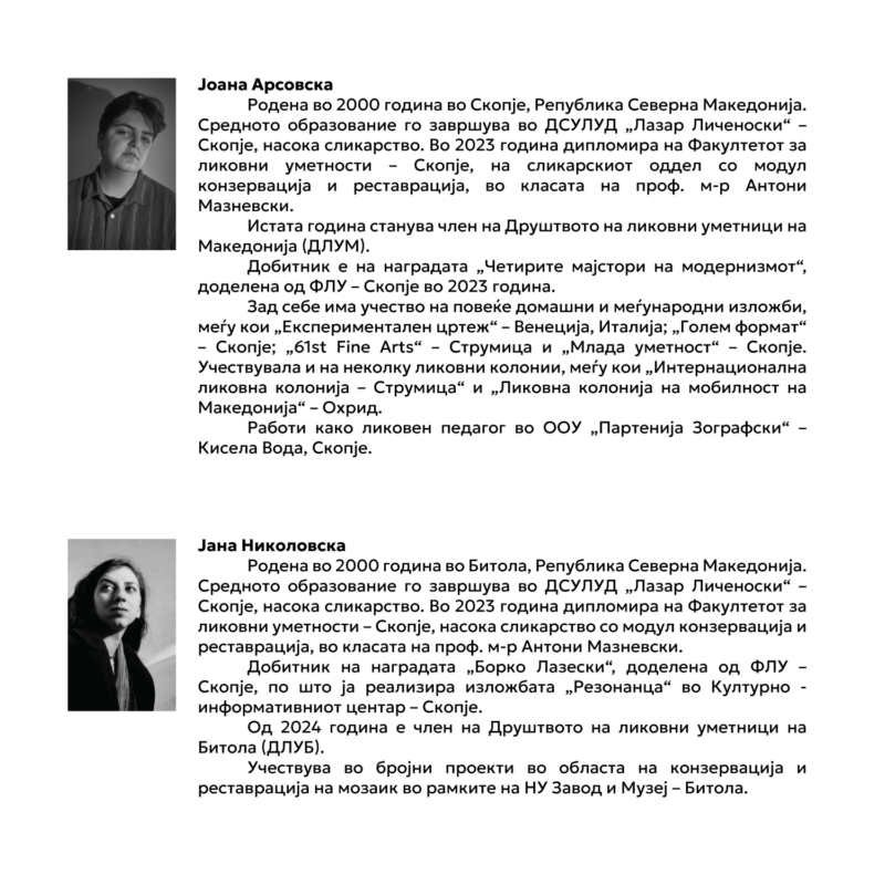 Јоана Арсовска и Јана Николовска се дипломирани сликари со конзервација и реставрација, дипломирале во 2023г. На Факултетот за ликовни уметности при Универзитетот „Св. Кирил и Методиј“ – Скопје, во класата на проф. Антони Мазневски. Своето уметничко образование го започнале во ДСУЛУД „Лазар Личеноски“ Скопје, на отсекот сликарски дизајн.