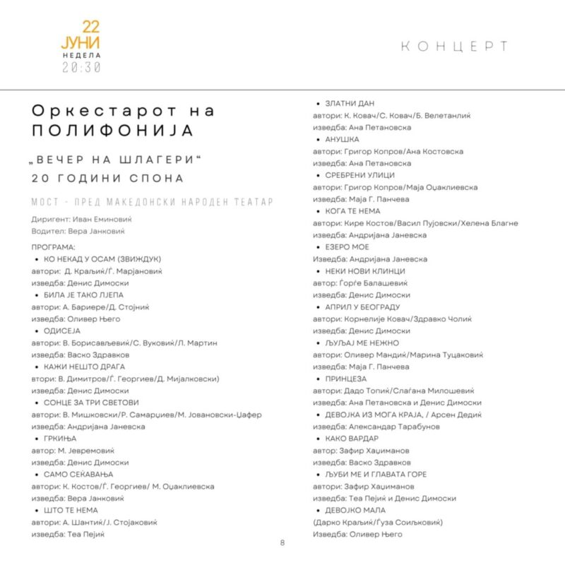 На сцената ќе настапат Оркестарот на „Полифонија“, а изведувачи се Денис Димоски, Оливер Њего, Васко Здравков, Андријана Јаневска, Вера Јанковиќ, Теа Пејиќ, Ана Петановска, Маја Г. Панчева и Александар Тарабунов.