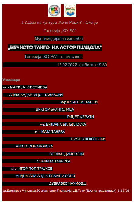 Вечерва во 19.30 часот во големиот салон на Галерија „КО-РА“ ќе биде отворена традиционалната мултимедијална групна изложба посветена на „Вечното танго на љубовта“ и славниот композитор Астор Пјацола.