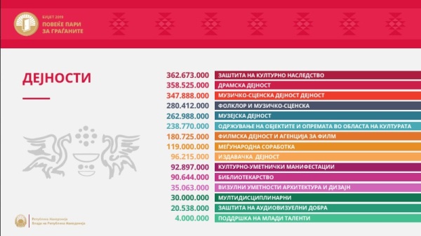 Во предлог-буџетот стои дека за театарски проекти се одвојуваат 358.525 милиони денари, за заштита на културното наследство 362.673 милиони денари, а за фолклор дури 280.412 милиони денари.