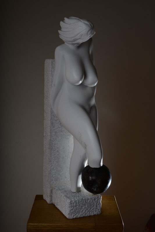Патинираниот постамент е дел од скулптурите во склад со целината. Вметнува и потенциран контраст на црно–бел однос со природната структура на мермерот.