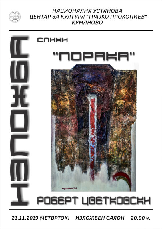 В четврток со почеток во 20 часот во Изложбениот салон на НУ Центар за култура „Трајко Прокопиев“ – Куманово ќе биде отворена изложба на слики со наслов „Порака“ од академскиот сликар Роберт Цветковски. Се работи за дваесеттина дела од неговата најнова продукцуја работени во техниката масло на платно.