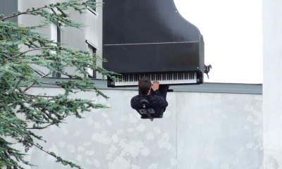 Швајцарскиот пијанист Алан Роше го одржа својот прв настап откако беше укинат карантинот поради коронавирусот на необичен начин, висејќи од кран на висина од 40 метри...