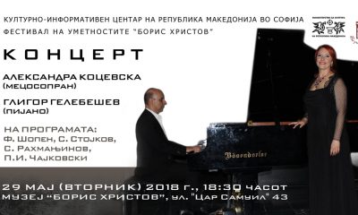Вечерва со почеток од 18:30 часот во концертната сала на Музејот „Борис Христов“ во Софија ќе се одржи концертот на Александра Коцевска (мецосопран) и Глигор Гелебешев...