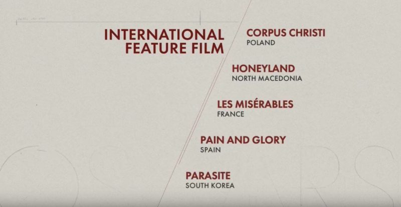 За најдобар странски филм, покрај „Медена земја“, номинирани се и „Корпус кристи“ од Полска, „Клетници“ од Франција, „Болка и слава“ од Шпанија и „Паразит“ од Јужна Кореја.