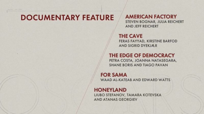 Меѓу петте номинирани за најдобар документарец се и „Американска фабрика“, „Пештерата“, „Доба на демократија“ и „За Сама“.