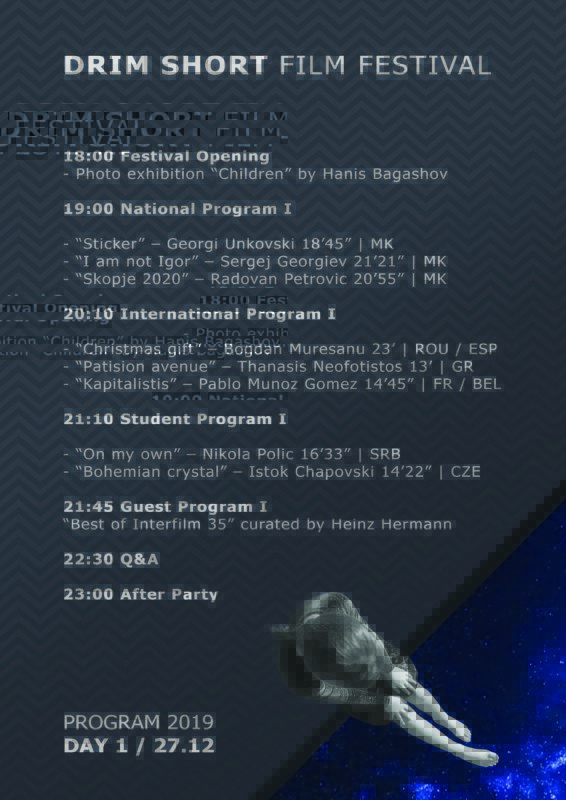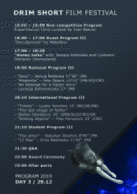 Третото издание на фестивалот на краток филм Drim Short ќе се одржи од 27 до 29 декември во Струга со мотото „Погледни под површината“. Под површината се кријат магијата на филмот и цели нови универзуми или коригирани рефлексии на светот во кој живееме. Таму филмските уметници кријат многу вистини за нашиот свет и преку филмското платно ја повикуваат публиката храбро да зачекори внатре. Од под површината секој може да понесе со себе по малку вистински вредности и размисли, кои со сигурност ќе ја разубават и реалноста. Под површината на струшкото еднолично и црно-бело постоење се крие културниот портал кон магијата на филмот, Drim Short 2019.
