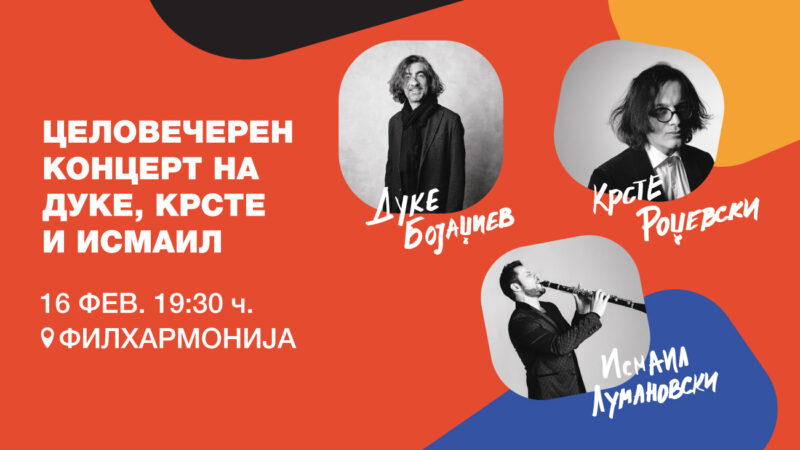 Целовечерен концерт на Дуке Бојаџиев, Крсте Роџевски и Исмаил Лумановски во Филхармонија