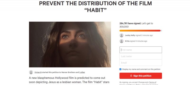 Филмот „Хабит“ се најде под удар на критики во јавноста уште пред дистрибуцијата. Речиси 300.000 луѓе потпишаа петиција во обид да ја забранат дистрибуцијата на филмот, кој е карактеризиран како богохулен бидејќи Исус е прикажан како лезбијка, иако тоа не се спомнува во промотивните материјали на филмот.