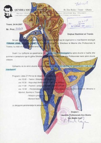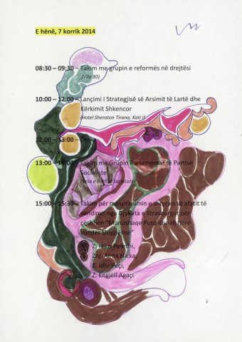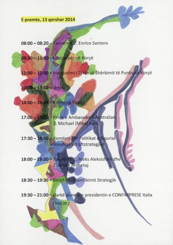 На изложбата во Берлин, како и претходно во Тирана, е и неговото дело што го наслика врз писмото до германската канцеларка Ангела Меркел, како и она врз писмото до албанскиот претседател Илир Мета за назначување министер за внатрешни работи.