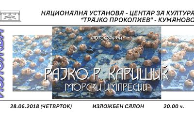 Со почеток во 20 часот во Изложбениот салон на НУ Центар за култура „Трајко Прокопиев“ – Куманово ќе биде отворена изложба на фотографии „Морски импресии“ од...