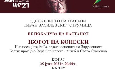 Друштвото за наука, литература, култура и уметност „Иван Василевски“ од Струмица утре (25 јуни) во Амфитеатарот во Градскиот парк ќе одржи книжевна вечер „Зборот на Конески“....