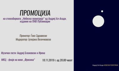 Вечерва со почеток од 20 часот во МКЦ ќе се одржи промоција на стихозбирката „Небесна геометрија“ од Андреј Ал-Асади. „’Небесна геометрија’ е негов трет поетски ракопис,...