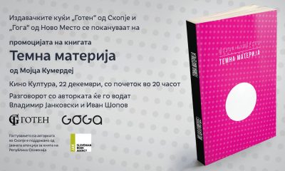 Издавачката куќа „Готен“ најави промоција на книгата „Темна материја“ од словенечката писателка Мојца Кумердеј. Промоцијата ќе се одржи во „Кино Култура“, на 22 декември, со почеток...