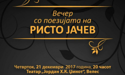 Во четврток, во фоајето на Театарот „Јордан Х.К-Џинот“ во Велес, со почеток во 20 часот ќе се одржи Вечер со поезијата на Ристо Јачев. Модератор на...