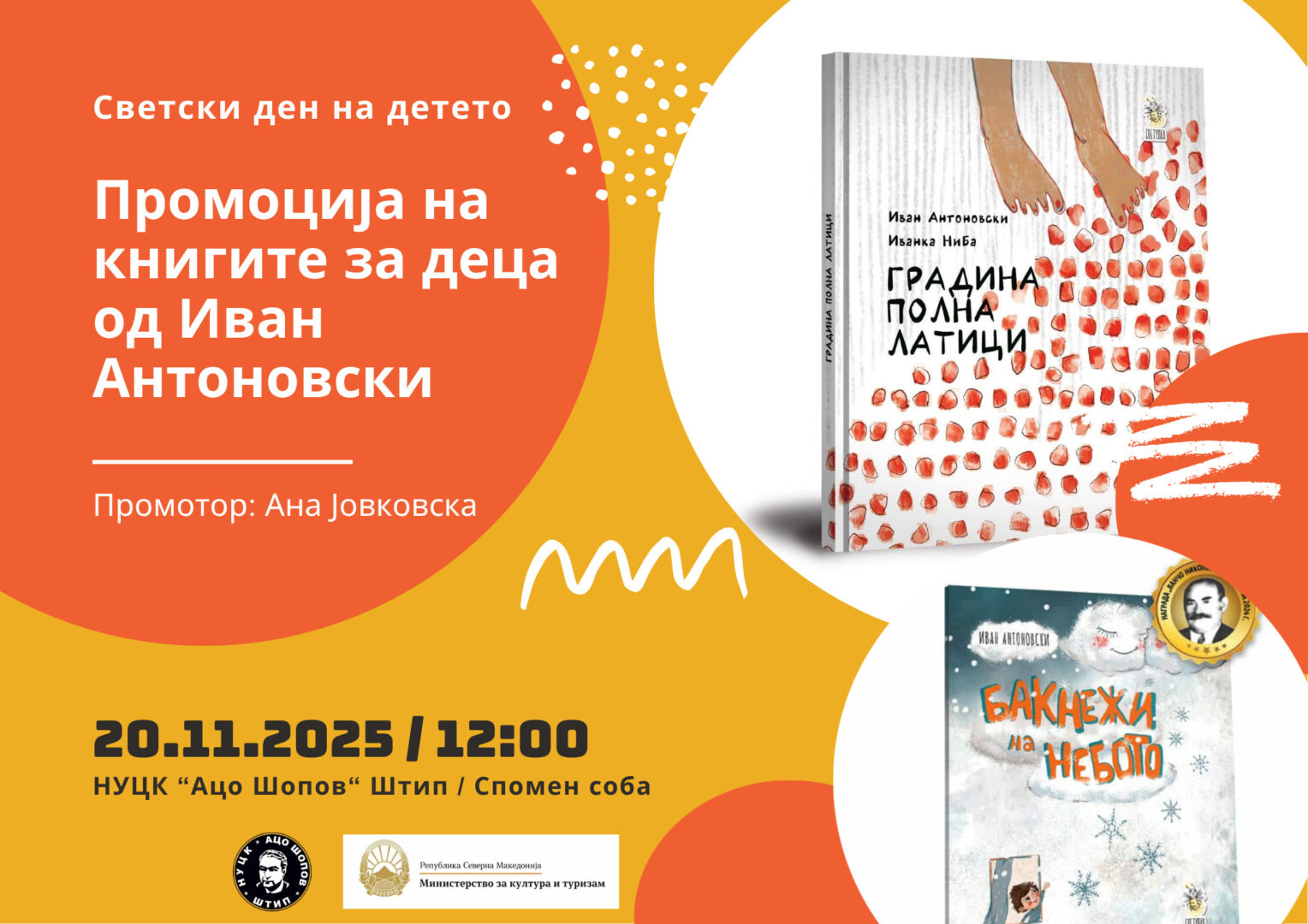 Светскиот ден на детето, 20 ноември, во Штип ќе се одбележи со промоција на книгите за деца од истакнатиот македонски автор Иван Антоновски – „Градина полна латици“ и „Бакнежи на небото“, и двете изданија на „Светулка“.