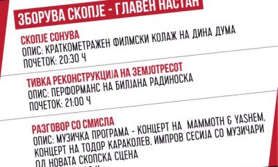 На зенитот од манифестацијата „Зборува Скопје“, вечерва во 20.30 часот, во галеријата „Графити“ во ГТЦ (кај автобуската постојка) ќе биде прикажан краткометражниот филмски колаж на младата...