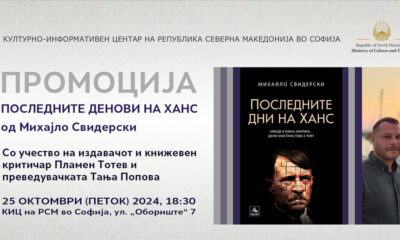 Македонскиот писател Михајло Свидерски ќе гостува во КИЦ на РС Македонија на 25 октомври (петок) од 18:30 часот по повод својот роман „Последните денови на Ханс“....