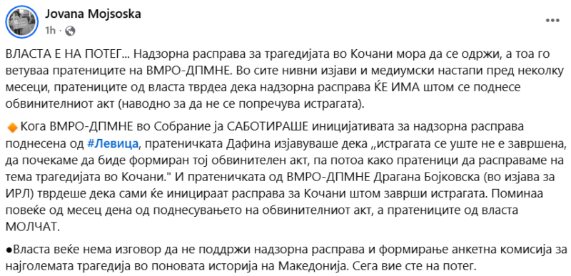 Пратеничката од партијата Левица, Јована Мојсоска, денеска, на нејзиниот Фејсбук профил, порача дека власта предводена од ВМРО-ДПМНЕ нема повеќе ниту еден аргумент да го одлага одржувањето на надзорна расправа за трагедијата во Кочани, имајќи предвид дека обвинителниот акт е поднесен пред повеќе од еден месец.