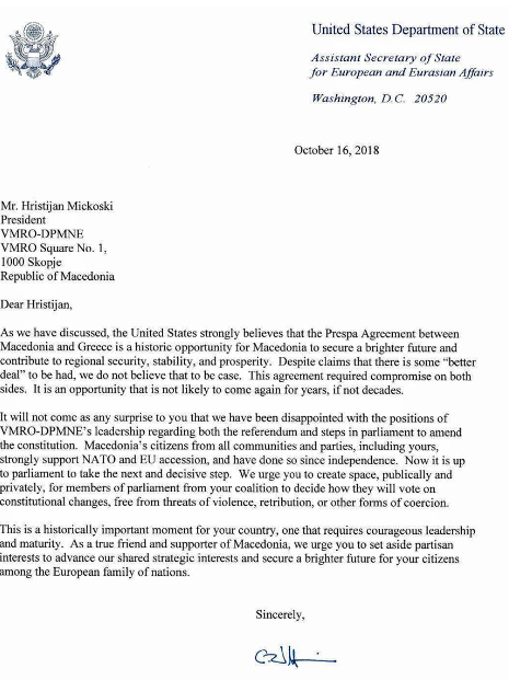 Американскиот помошник-државен секретар, Вес Мичел, испрати писмо до лидерот на ВМРО-ДПМНЕ, Христијан Мицкоски, во кое наведува дека САД се разочарани од позициите на челниците на ВМРО-ДПМНЕ како во однос на референдумот така во однос и на чекорите во Собранието за промена на Уставот. Мичел го повикува Мицкоски да создаде простор, во јавноста и приватно, за пратениците од коалицијата да одлучат како ќе гласаат за уставните промени, ослободени од закани од насилство, одмазда или друг облик на принуда.