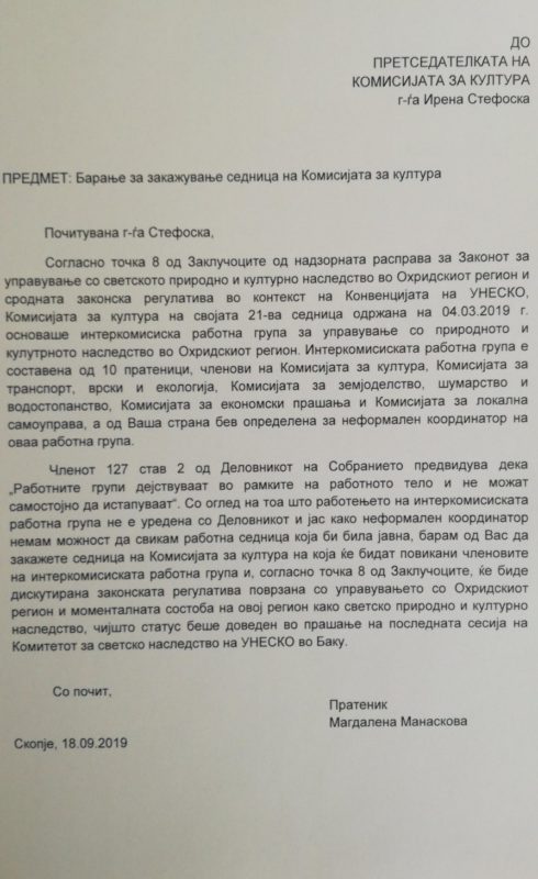 „Претседателката на Комисијата за култура, Ирена Стефоска, не само што не закажува продолжение на надзорната расправа туку одбива да одговори и на официјалните барања испратени до неа. Нефункционирањето на оваа Комисија се гледа и од фактот што Националната стратегија за развој на концептот за едно општество и интеркултурализам не се разгледува на Комисијата за култура, туку на Комисијата за политички систем и односи меѓу заедниците.