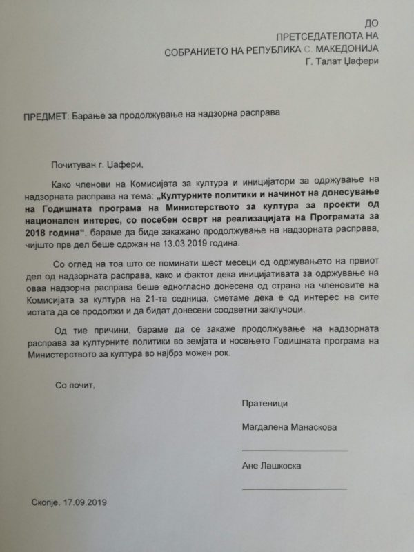Во прилог ви ги доставуваме писмените барања од пратеничката група на ВМРО-ДПМНЕ, во кои јасно се наведува што бараме да се дебатира на Комисијата за култура“, велат од пратеничката група на ВМРО-ДПМНЕ.