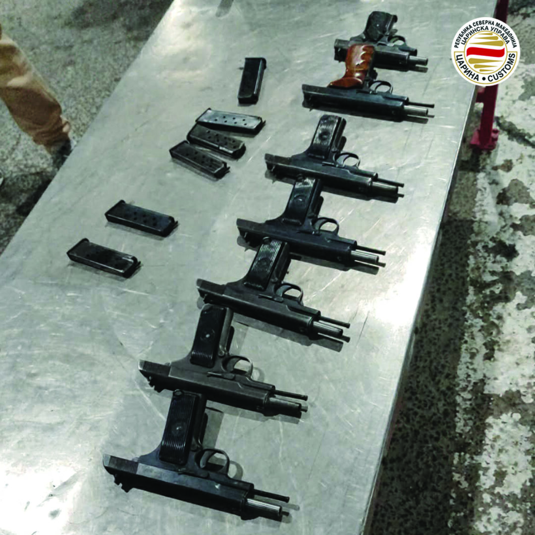 Царинската управа соопшти дека е спречен обид за сериозен меѓународен криминал, при што биле запленети девет пиштоли од кои пет со голема пробивна моќ, а едно лице, македонски државјанин, е лишено од слобода и се наоѓа во притвор.