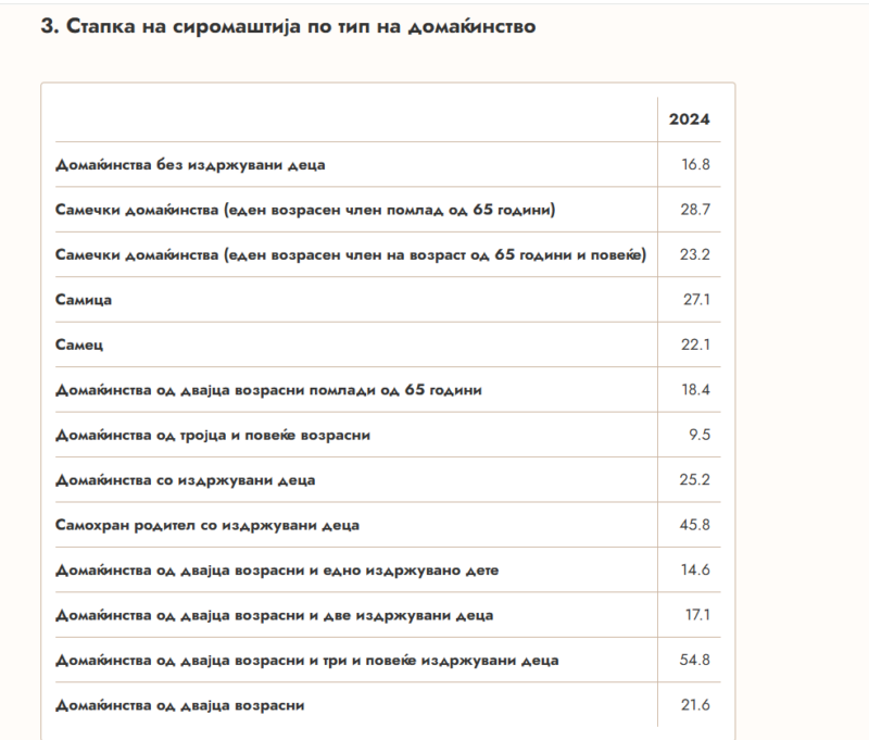 Анализирано по тип на домаќинства, стапката на сиромаштија кај домаќинствата составени од двајца возрасни и две издржувани деца изнесувала 17,1 отсто, додека кај самохраните родители со издржувани деца достигнала 45,8 отсто. Кај домаќинствата со двајца возрасни и три или повеќе издржувани деца, стапката изнесувала 54,8 отсто.