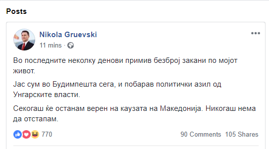 „Во последните неколку дена примив безброј закани за мојот живот. Јас сум во Будимпешта и побарав политички азил од унгарските власти. Секогаш ќе ѝ останам верен на каузата на Македонија. Никогаш нема да отстапам“, напиша Груевски.