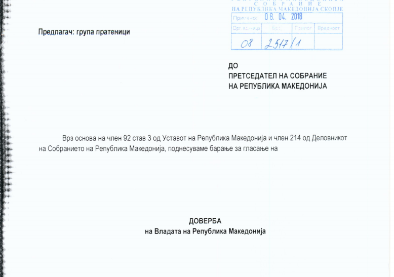 Единствени проекти коишто ги спроведе Владата на СДСМ и ДУИ во изминатиов период се нагло партизирање на институциите и нивно деградирање, заробено судство, луксузирање на владините функционери со парите на граѓаните и политички реваншизам – ова е дел од образложението наведено во барањето за гласање доверба на Владата, кое вчера ВМРО-ДПМНЕ го достави до Собранието. Барањето е потпишано од 41 пратеник и се очекува да биде ставено на седница в среда.