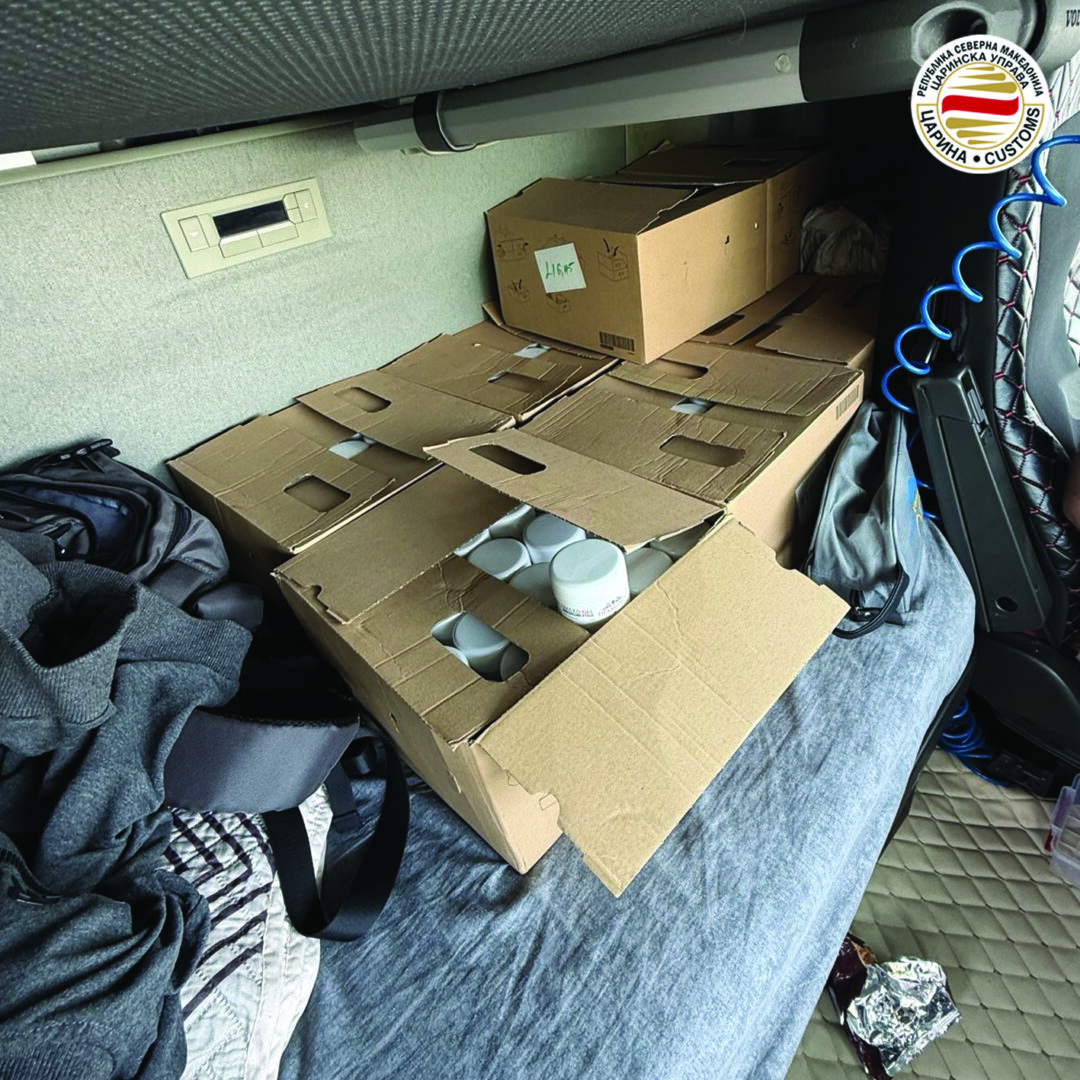 На граничниот премин Богородица мобилен царински тим при контрола на камион откри и спречи обид за нелегален внес на 100 килограми ветеринарни препарати и додатоци за исхрана за добиток. По извршена контрола со мобилен скенер, биле забележани неправилности во кабината на возилото, по што бил извршен деталeн преглед. На креветите во кабината биле пронајдени 100 килограми Tonisity Px и 7,5 литри Neo Boost – препарати наменети за исхрана и поддршка на растот кај прасињата и свињите. Станува збор за производи под ветеринарно-санитарна контрола, за чиј увоз е потребна посебна дозвола издадена од Агенцијата за храна и ветеринарство. Возачот, македонски државјанин, не поседувал соодветна документација за стоката. Против него е поведена прекршочна постапка, а пронајдените производи се привремено задржани за понатамошна постапка.
