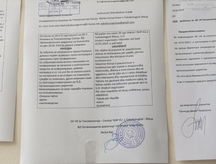 „Клиниката за токсикологија – Скопје, в.д. организацискиот директор на Клиниката, на 20.5.2024 ја донесе следната НАРЕДБА за забрана на неовластено присуствување, давање изјави за јавност преку интервјуа и свикување прес-конференции. Се забранува неовластено свикување конференции за печатени и електронски средства за информирање, давање интервјуа и слично, со што би се нанело штета на угледот на Клиниката. Средби со новинари, други медиуми, само со претходно известување до в.д. организацискиот директор. Непочитувањето на оваа наредба подлежи на сакнционирање“, се наведува во наредбата.