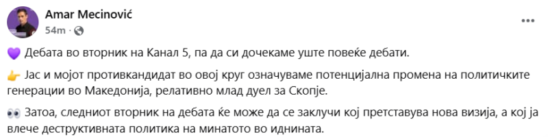 „Дебата во вторник на Канал 5, па да си дочекаме уште повеќе дебати. Јас и мојот противкандидат во овој круг означуваме потенцијална промена на политичките генерации во Македонија, релативно млад дуел за Скопје. Затоа, следниот вторник на дебата ќе може да се заклучи кој претставува нова визија, a кој ја влече деструктивната политика на минатото во иднината“, напиша Мециновиќ на Фејсбук.